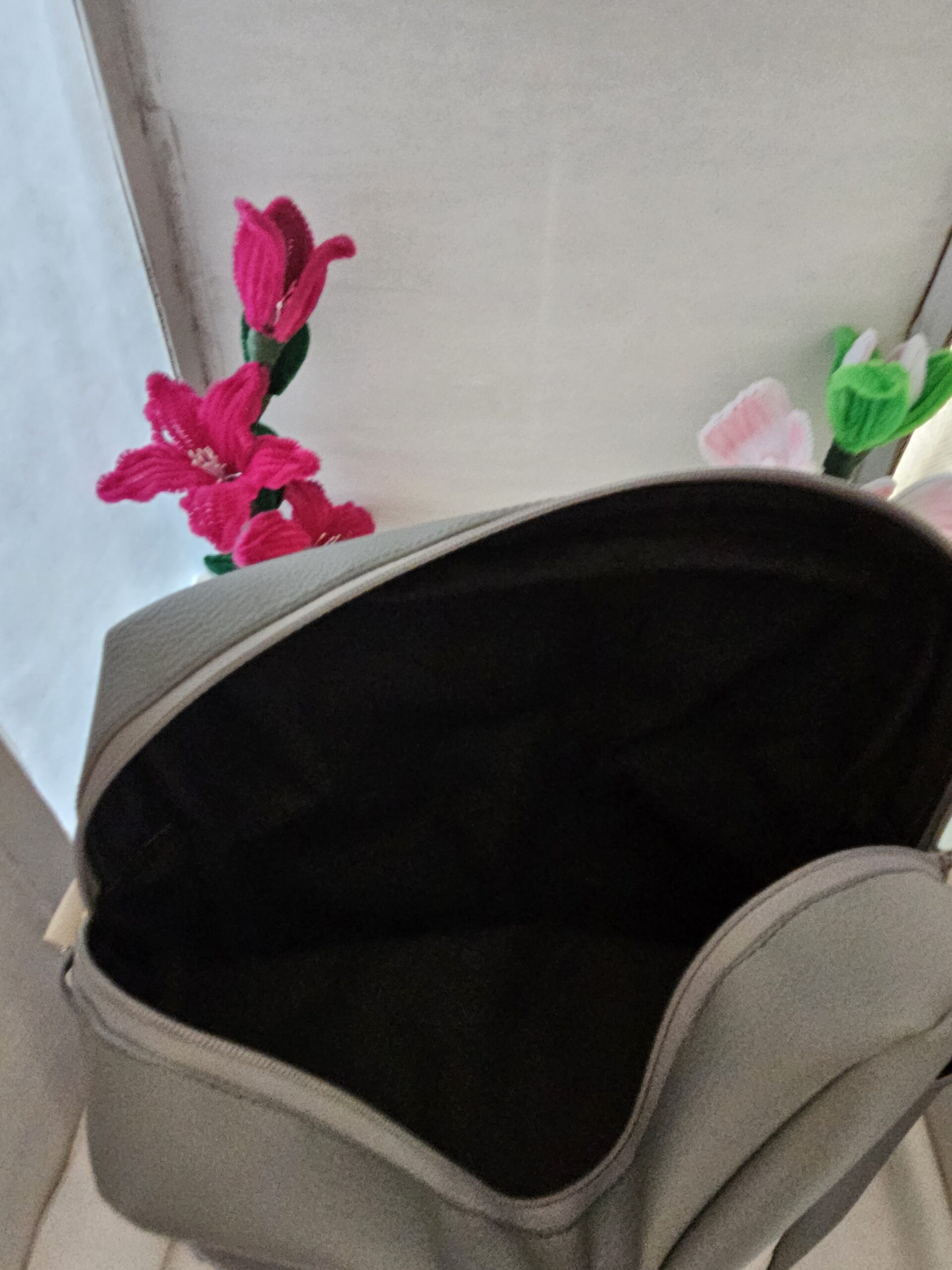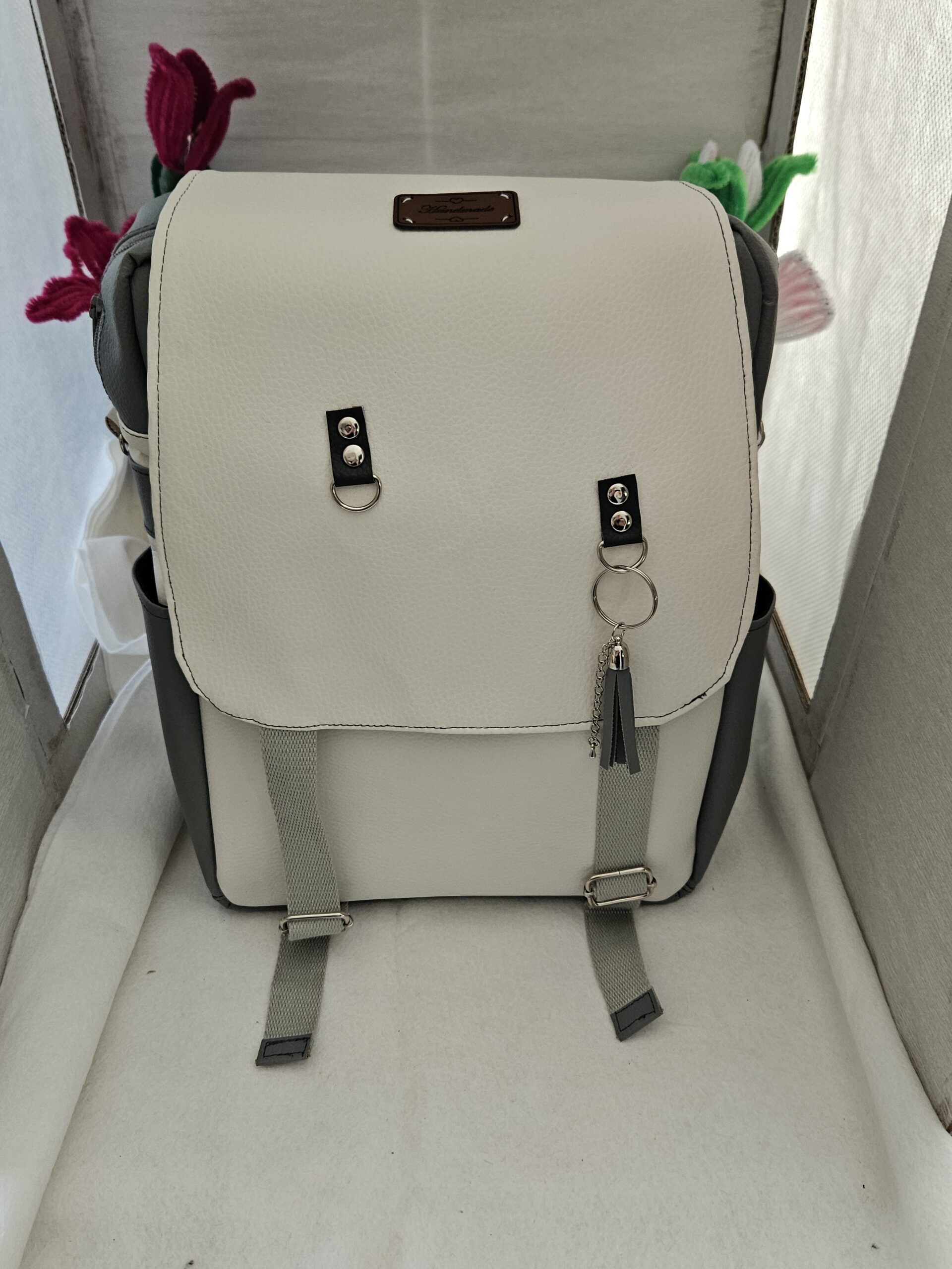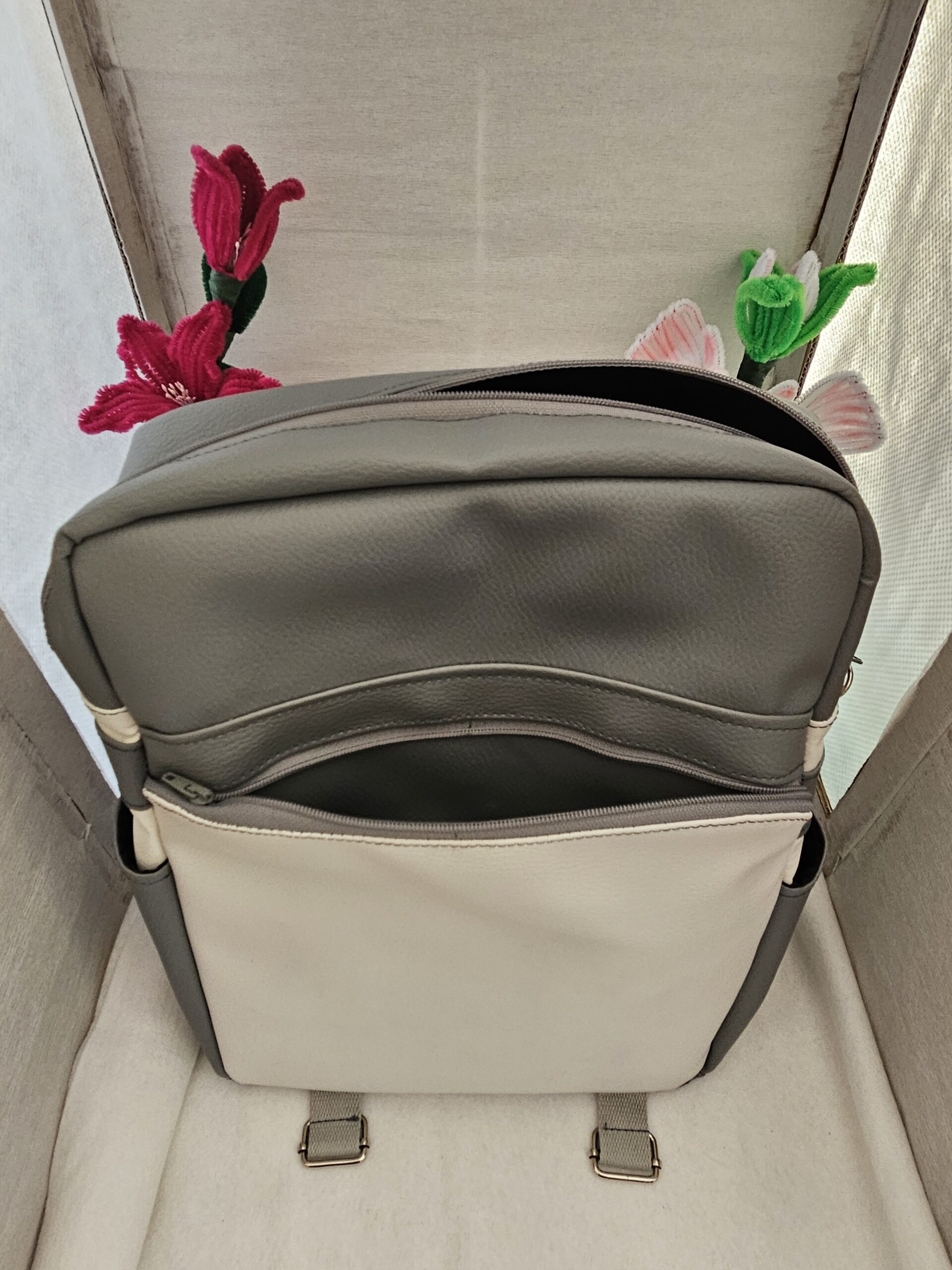 Les sac à dos est fabriquer en simili cuir gris et blanc avec une poche à l’avant à zippe et deux petites poche sur les côtes.