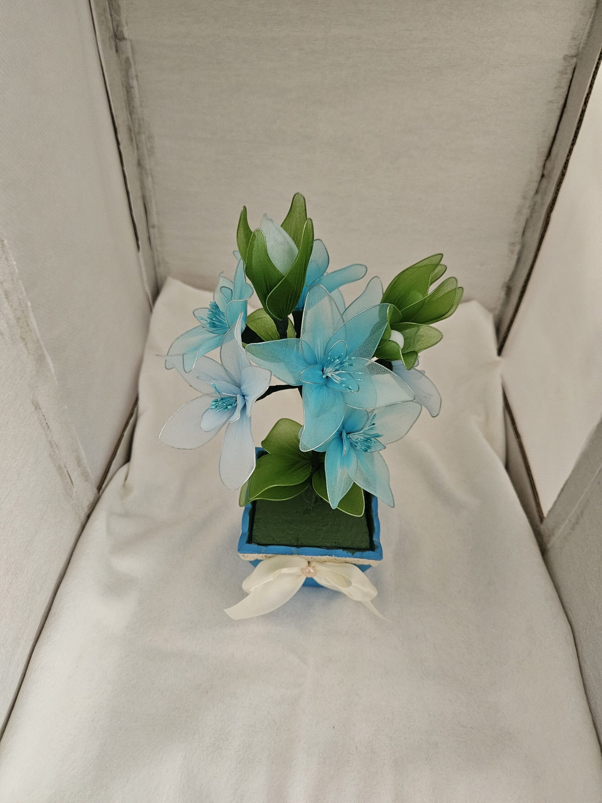 Les fleurs en nylon bleu ciel et les feuilles verte style collants fait main sont placer dans un pot bleu et décorer avec soin.